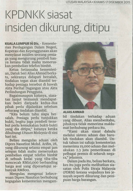 2444) UTUSAN MALAYSIA – 17/12/15 – KPDNKK SIASAT INSIDEN DIKURUNG DAN DITIPU