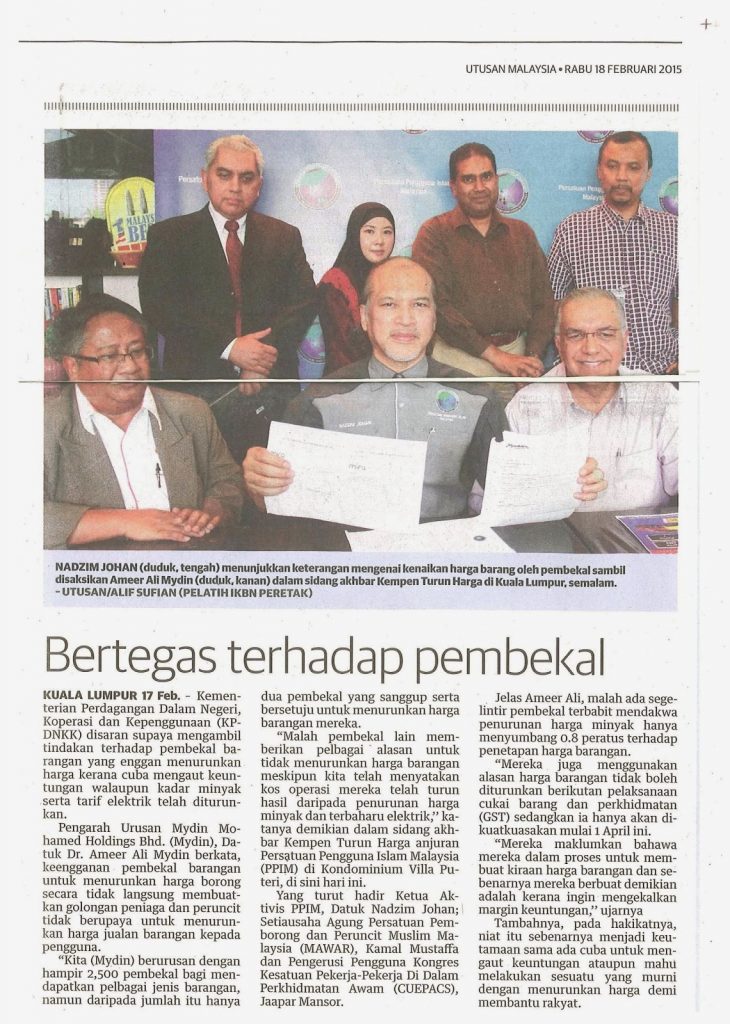 “Malah pembekal lain memberikan pelbagai alasan untuk tidak menurunkan harga barangan meskipun kita telah menyatakan kos operasi mereka telah turun hasil daripada penurunan harga minyak dan terbaharu elektrik,’’ katanya demikian dalam sidang akhbar Kempen Turun Harga anjuran Persatuan Pengguna Islam Malaysia (PPIM) di Kondominium Villa Puteri, di sini hari ini.