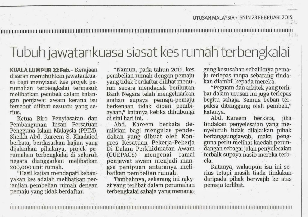 2496) UTUSAN – 23/02/2015 – Tubuh Jawatankuasa Siasat Kes Rumah Terbengkalai