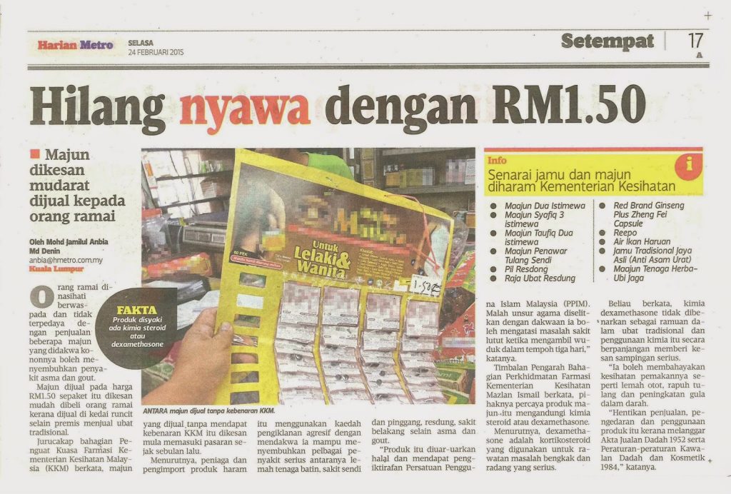 Kuala Lumpur: Orang ramai dinasihati berwaspada dan tidak terpedaya dengan penjualan beberapa majun yang didakwa kononnya boleh menyembuhkan penyakit asma dan gout.