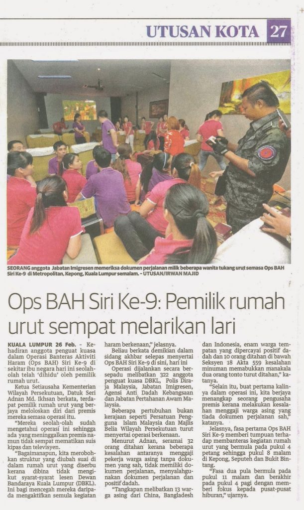 Jelasnya, fasa pertama Ops BAH Siri Ke-9 memberi tumpuan terhadap membanteras kegiatan rumah urut yang bermula pada pukul 4 petang sehingga pukul 8 malam di Kepong, Seputeh dan Bukit Bintang.