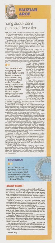 Betullah kata seorang kawan, hidup ini penuh dengan penipuan. Bunyinya macam kejam tetapi ada kebenarannya. Kalau tidak dapat menipu kita depan-depan, di belakang-belakang dan di alam siber pun boleh. Yang duduk diam-diam tidak kacau orang pun boleh kena tipu, inikan pula yang tidak reti duduk diam.