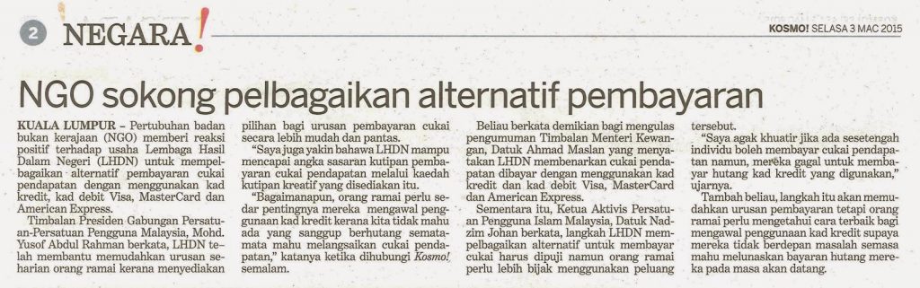 2506) HARIAN METRO – 03/03/2015 – NGO Sokong Pelbagaikan Alternatif Pembayaran