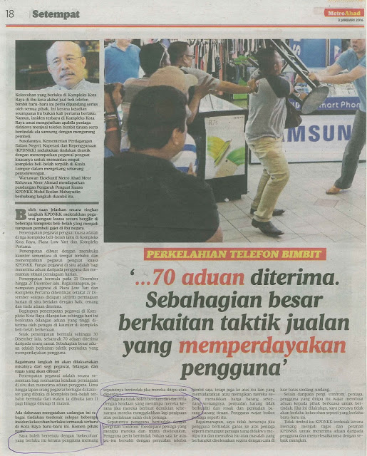 2521) HARIAN METRO – 3/1/16 – 70 ADUAN DI TERIMA. SEBAHAGIAN BESAR BERKAITAN TAKTIK JUALAN YANG MEMPERDAYA PENGGUNA