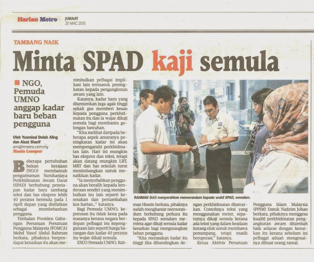 EXCO Pemuda UMNO, Rahman Hussin berkata, pihaknya sudah menghantar memorandum berhubung perkara itu kepada SPAD semalam meminta agar dikaji semula kadar kenaikan bagi mengurangkan beban pengguna.