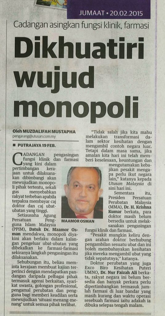 Setiausaha Agung Persatuan Pengguna Islam Malaysia (PPIM), Datuk Dr. Ma’amor Osman mendakwa, monopoli diyakini akan berlaku dalam kalangan pengeluar ubat-ubatan yang dibekalkan ke farmasi-farmasi sekiranya langkah pengasingan itu dilaksanakan.