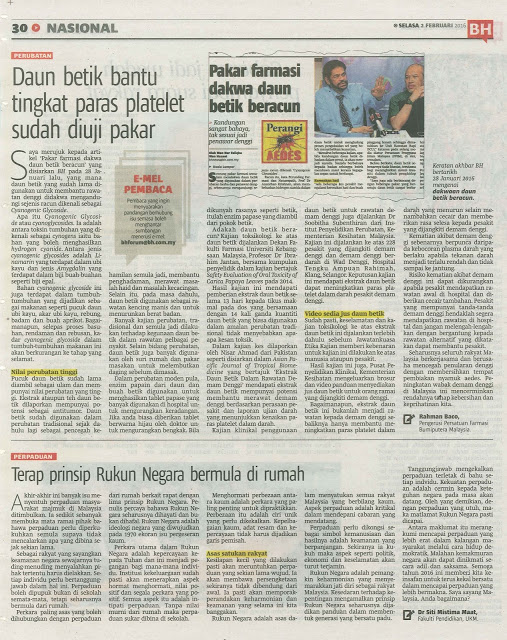 2534) BERITA HARIAN – 2/2/16 – DAUN BETIK BANTU TINGKAT PARAS PLATELET SUDAH DIUJI PAKAR