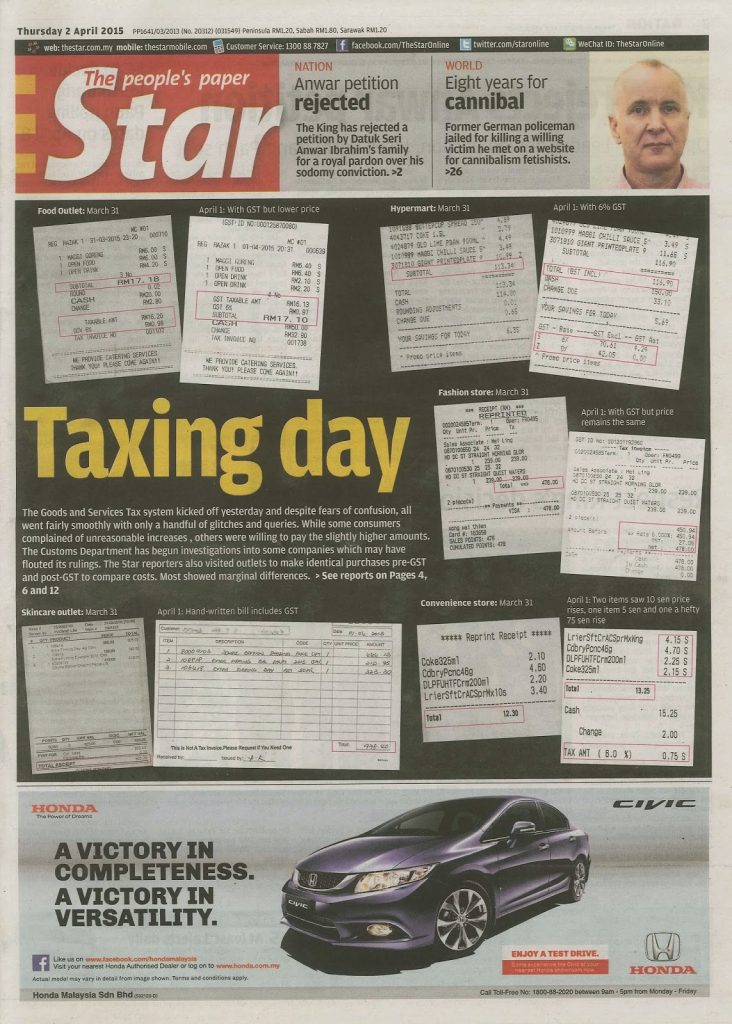 Describing it as the most complex and multi-layered GST imposed in the world, he said it came with a lower personal and corporate taxes. For 2015, personal tax is reduced between 1% and 3% while corporate tax is brought down to 24%.