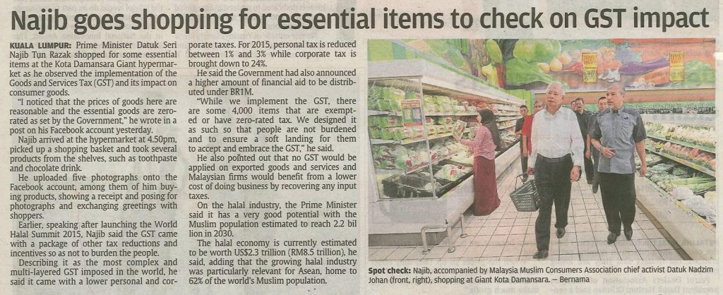 KUALA LUMPUR: Prime Minister Datuk Seri Najib Tun Razak shopped for some essential items at the Kota Damansara Giant hypermarket as he observed the implementation of the Goods and Services Tax (GST) and its impact on consumer goods.