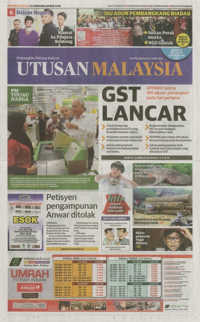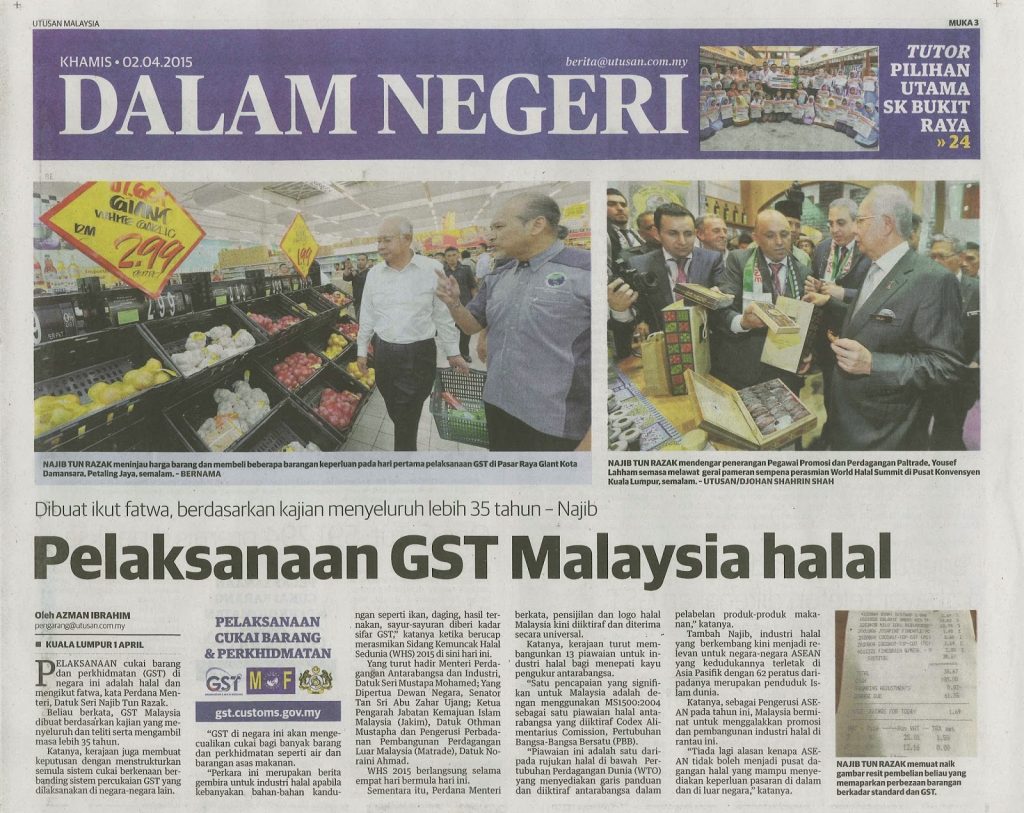 “Perkara ini merupakan berita gembira untuk industri halal apabila kebanyakan bahan-bahan kandungan seperti ikan, daging, hasil ternakan, sayur-sayuran diberi kadar sifar GST,” katanya ketika berucap merasmikan Sidang Kemuncak Halal Sedunia (WHS) 2015 di sini hari ini.