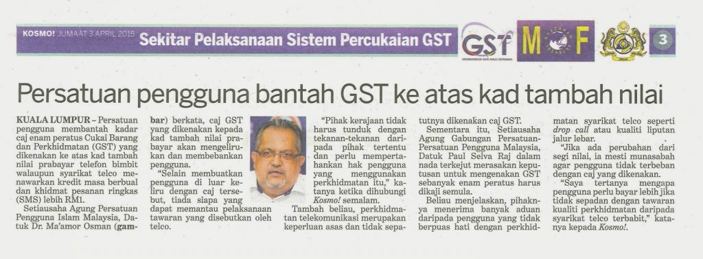 2544) KOSMO – 03/04/2015 – Persatuan Pengguna Bantah GST ke Atas Kad Tambah Nilai