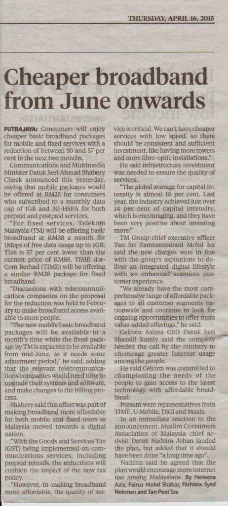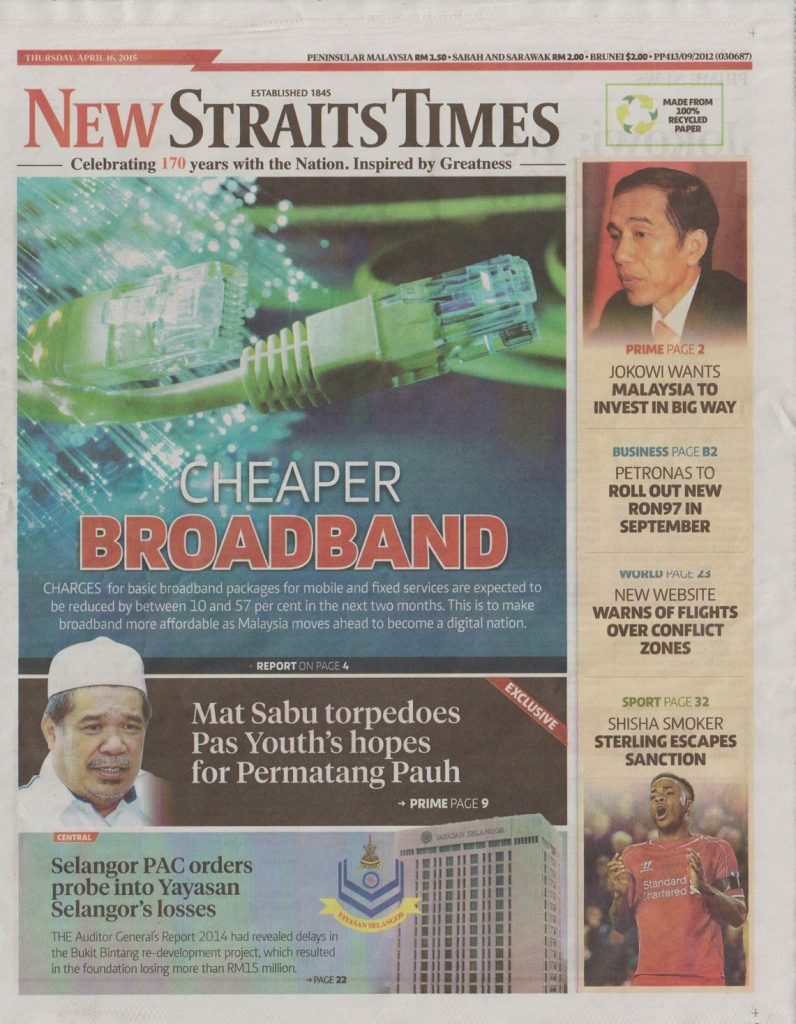 2569) NEW STRAITS TIMES – 16/04/15 – Cheaper Broadband From June Onwards