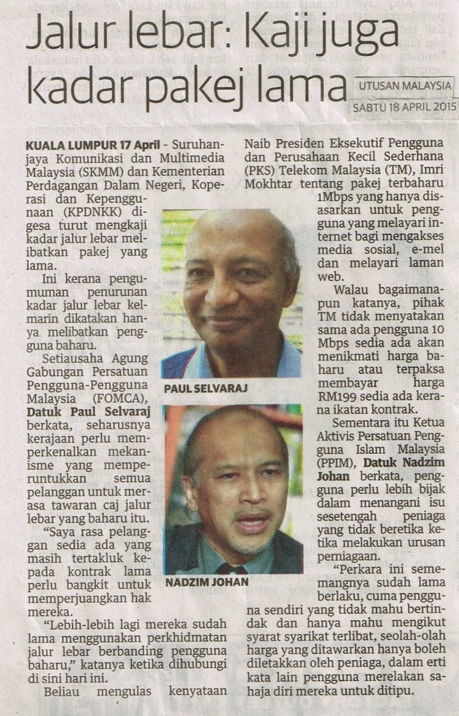2575) UTUSAN MALAYSIA – 18/04/15 – Jalur Lebar: Kaji Juga Kadar Pakej Lama