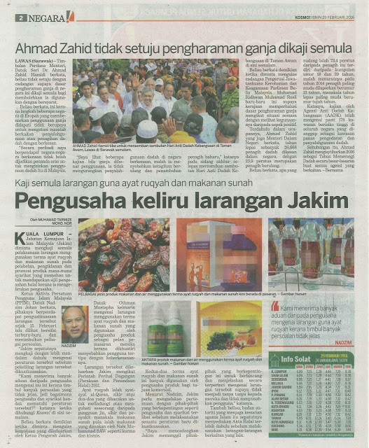 Beliau berkata demikian ketika diminta mengulas kenyataan yang dikeluarkan oleh Ketua Pengarah Jakim, Datuk Othman Mustapha kelmarin mengenai larangan menggunakan terma ayat ruqyah dan makanan sunah yang digunakan oleh pengusaha produk sebagai pelan pemasaran mereka kerana dikhuatiri menyebabkan pengguna tertipu dengan keberkesanannya.