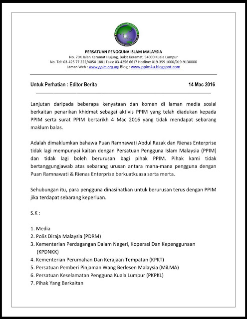 2608) PPIM – 14/3/16 – RIENAS ENTERPRISE TIDAK LAGI DI BAWAH PERSATUAN PENGGUNA ISLAM MALAYSIA
