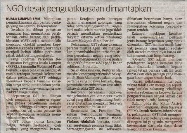 Dalam pada itu, Ketua Aktivis Persatuan Pengguna Islam Malaysia (PPIM), Datuk Nadzim Johan berkata, pelaksanaan GST telah memperlihatkan sikap kebanyakan peniaga di negara ini yang suka mengambil kesempatan daripada dasar-dasar yang ditetapkan kerajaan.