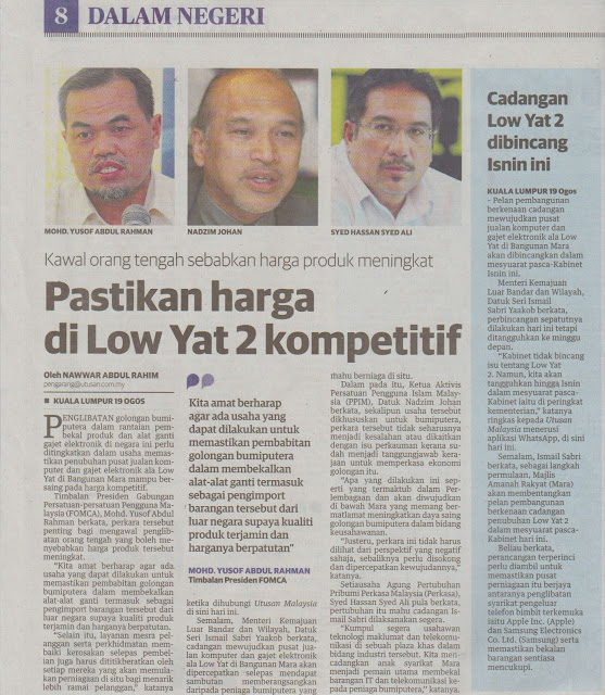 2808) UTUSAN MALAYSIA – 20/8/2015 – PASTIKAN HARGA DI LOW YAT 2 KOMPETITIF