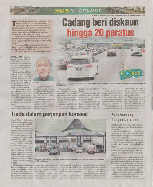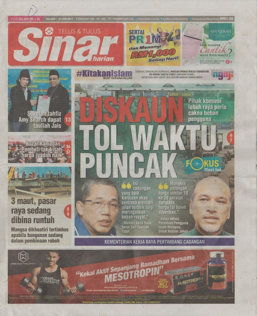 2813) SINAR HARIAN – 23/6/2015 – DISKAUN TOL WAKTU PUNCAK