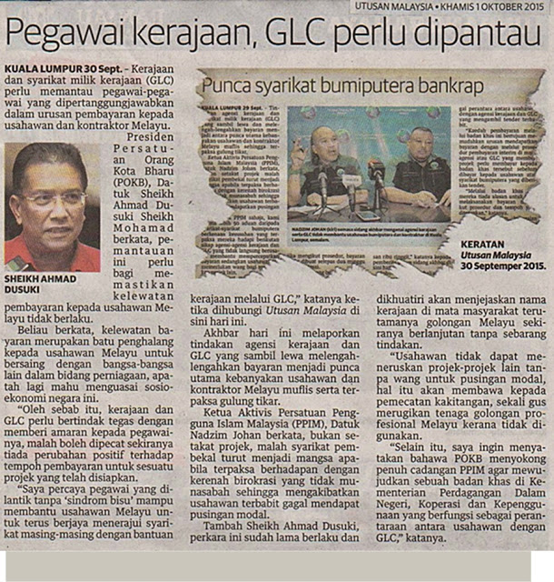 2866) UTUSAN MALAYSIA – 1/10/2015 – PEGAWAI KERAJAAN, GLC PERLU DIPANTAU