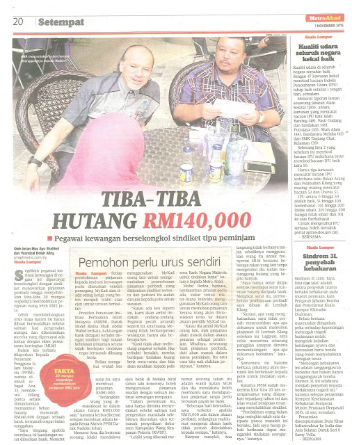 2931) HARIAN METRO – 1/11/15 – TIBA-TIBA HUTANG RM140,000