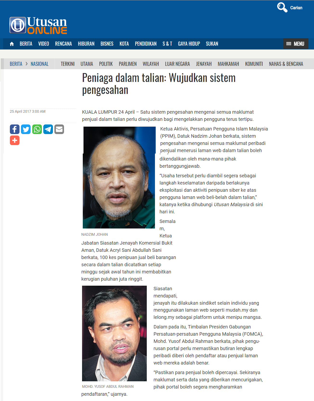 Dalam pada itu, Timbalan Presiden Gabungan Persatuan-persatuan Pengguna Malaysia (FOMCA), Mohd. Yusof Abdul Rahman berkata, pihak pengurusan portal perlu memastikan butiran lengkap peribadi diberi oleh pendaftar atau penjual laman web mereka adalah benar.