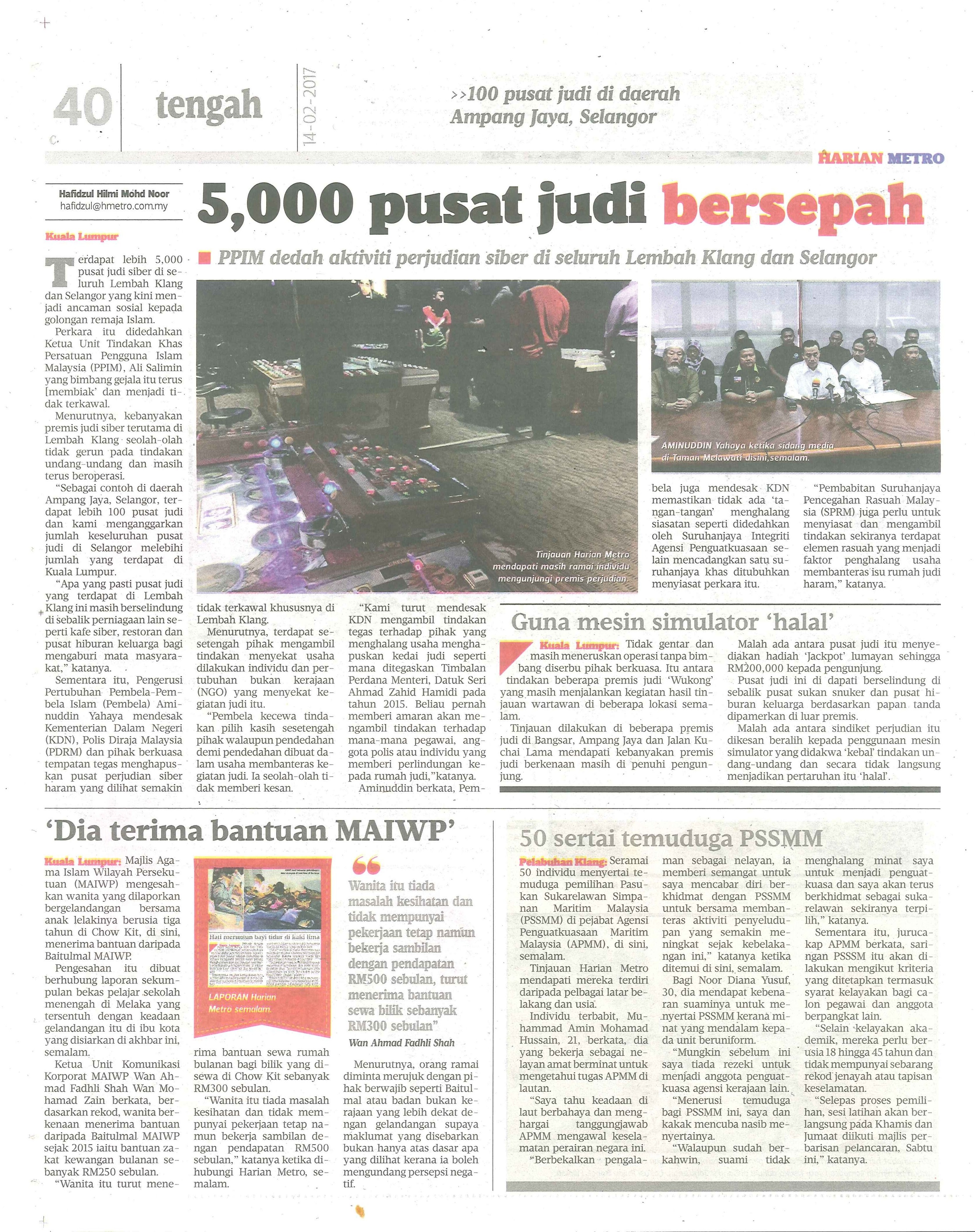 “Kami turut mendesak KDN mengambil tindakan terhadap pihak yang menghalang usaha menghapuskan kedai judi sepertimana ditegaskan Timbalan Perdana Menteri, Datuk Seri Ahmad Zahid Hamidi pada tahun 2015. Beliau pernah memberi amaran akan mengambil tindakan terhadap mana-mana pegawai, anggota polis atau individu yang memberi perlindungan kepada rumah judi,”katanya.