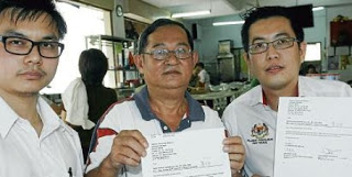 Siow Tin Hwa (centre) showing his notice with Mak Kah Keong (left) and Ben Liew Pok Boon. Pic by Che Rani Che Din