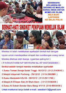 Diharap kejadian ini dapat memberi peringatan kepada kita semua supaya lebih berhati2 dimasa hadapan. Mungkin kalau ia nya terjadi dikawasan kawan2, dicadangkan supaya butir2 peribadi mereka (IC no, alamat, gambar, phone numbers dsbnya) dapat dicatitkan. Pemberian wang harus dibuat berhati2 .. mungkin tak diberi terus, tetapi hanya diberi setelah urusan pengislaman mereka telah direkodkan oleh pehak berkuasa atau sebagainya …