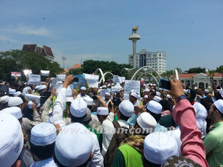 kira-kira 300 jemaah mengadakan demonstrasi aman di hadapan Masjid Zahir