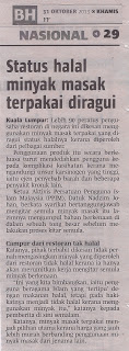 952) BERITA HARIAN 31/10/13-Status halal minyak masak terpakai diragui