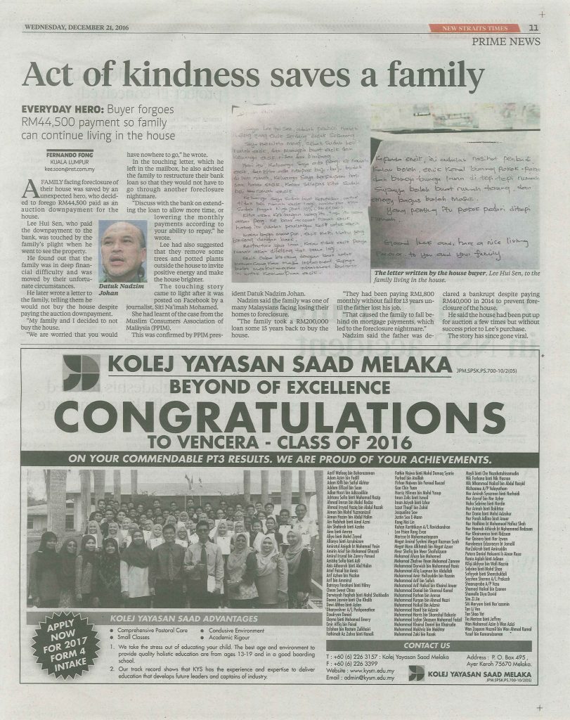 KUALA LUMPUR: A family facing foreclosure on their home was saved by an benevolent stranger who decided to forego the RM44,500 he had paid as a down payment for the home which went up for auction. Lee Hui Sen, who had settled the payment with the bank, was touched by the family’s plight when he went to check out the property. He found out that the family was in deep financial difficulties and was moved by their circumstances. When he visited, Lee saw children’s clothing hanging outside, left to dry amid the gloomy weather. That sight moved him. Lee later wrote a letter to the family, telling them that he would not be buying the house after all, despite having the paid the down payment. “My family and I decided not to buy the house after all as we are worried that you would have nowhere to go,” he wrote. In the touching letter, which was left in the family’s mailbox, Lee also advised the family to restructure the bank loan so that they will not have to go through another foreclosure nightmare. “Try discussing it with the bank on extending the loan to allow more time (for repayment) or lower the monthly payments according to your ability to repay,” he wrote. He also had another advice for the family. Lee suggested that they removed some of the trees and flower pots outside the house to invite more positive energy into the home and make the house brighter. This moving tale came to light after it was shared on Facebook by journalist Siti Na’imah Mohamed. She had apparently learned about the case during a press conference by the Muslim Consumers Association of Malaysia (PPIM). The account was confirmed by PPIM president Datuk Nadzim Johan. According to him, the family’s plight is similar to many Malaysians who are facing the possibility of losing their homes due to foreclosure. “The family took a loan for about RM200,000 some 15 years back to buy the house. “They have been paying the monthly instalment of RM1,800 without missing (a month) for 13 years until the father lost his job. “That caused the family to fall behind on mortgage payments and it led to the foreclosure nightmare,” he said. Nadzim added that the father was declared bankrupt despite having paid RM40,000 in 2014 to prevent foreclosure of the house. He said the house had also been auctioned a few times without success prior to Lee’s purchase. The story has since gone viral as other websites have picked up on the story, which affirms that kindness and compassion still exists in this (sometimes) cold world.