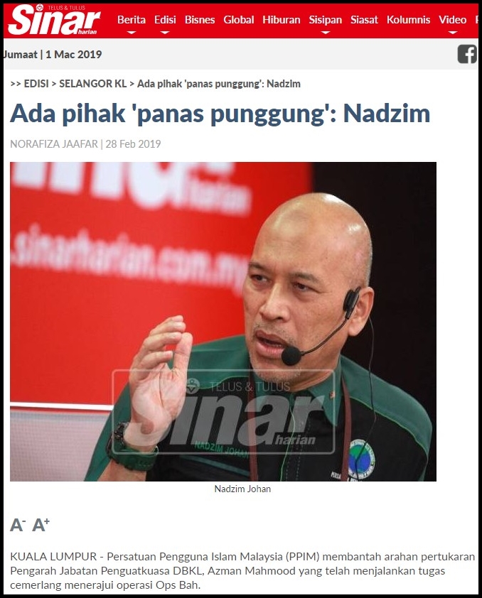 KUALA LUMPUR – Persatuan Pengguna Islam Malaysia (PPIM) membantah arahan pertukaran Pengarah Jabatan Penguatkuasa DBKL, Azman Mahmood yang telah menjalankan tugas cemerlang menerajui operasi Ops Bah.