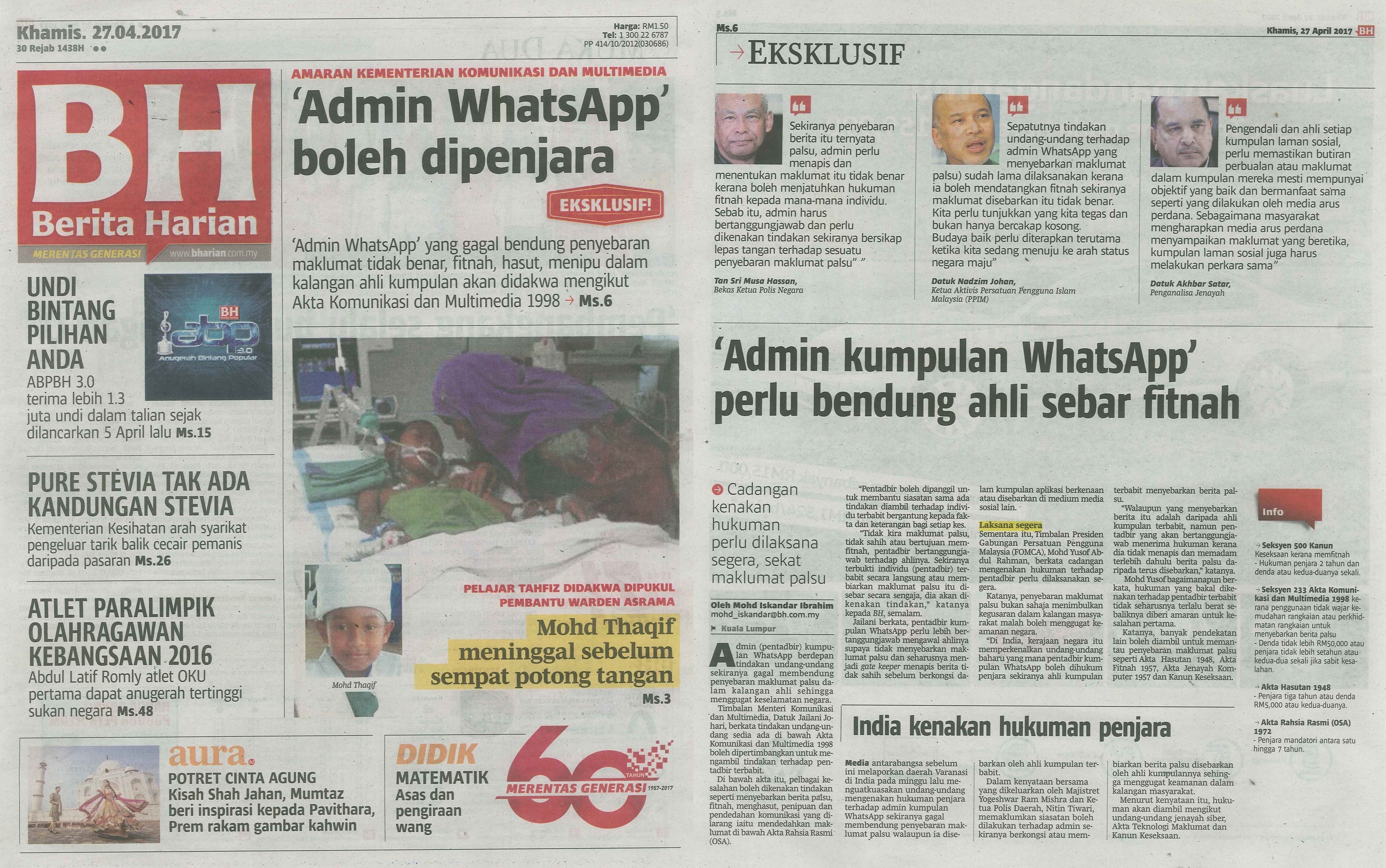 “Di India, kerajaan negara itu memperkenalkan undang-undang baharu yang mana pentadbir kumpulan WhatsApp boleh dihukum penjara sekiranya ahli kumpulan terbabit menyebarkan berita palsu.