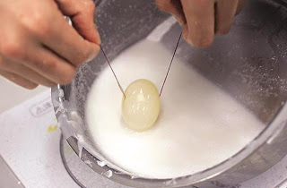 The ‘yolk’ is shaped in the round mould. ‘Magic water’ containing calcium chloride is used.