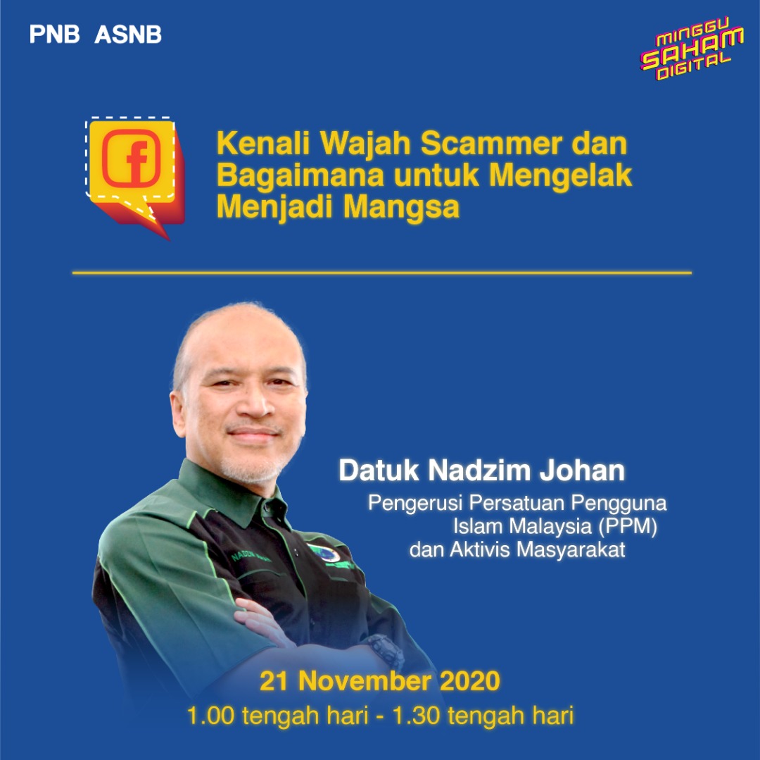 Ketua Aktivis PPIM, Nadzim Johan@toqqi bersiaran di Live Facebook Minggu Saham Digital bagi mengupas topik “Kenali Wajah Scammer dan Bagaimana untuk Mengelak Menjadi Mangsa”