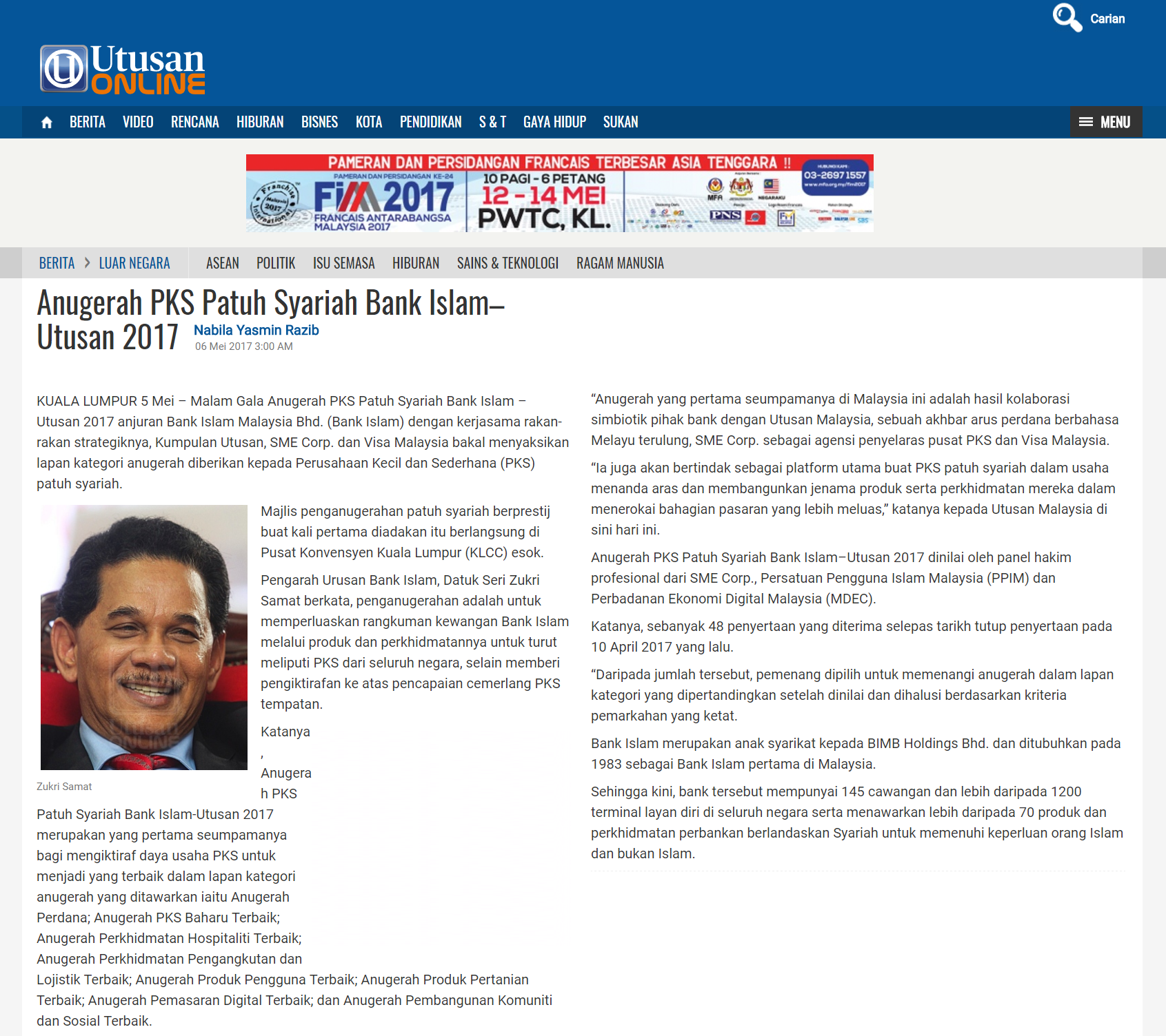 “Anugerah yang pertama seumpamanya di Malaysia ini adalah hasil kolaborasi simbiotik pihak bank dengan Utusan Malaysia, sebuah akhbar arus perdana berbahasa Melayu terulung, SME Corp. sebagai agensi penyelaras pusat PKS dan Visa Malaysia.