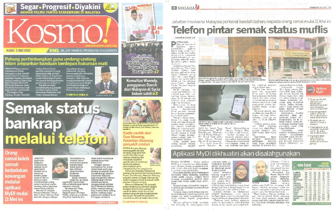 Beliau mengulas tentang pengenalan aplikasi MyDI yang akan dilaksanakan oleh Jabatan Insolvensi Malaysia mulai 11 Mei ini bagi membolehkan orang ramai mengetahui status kebankrapan mana-mana individu melalui telefon pintar.