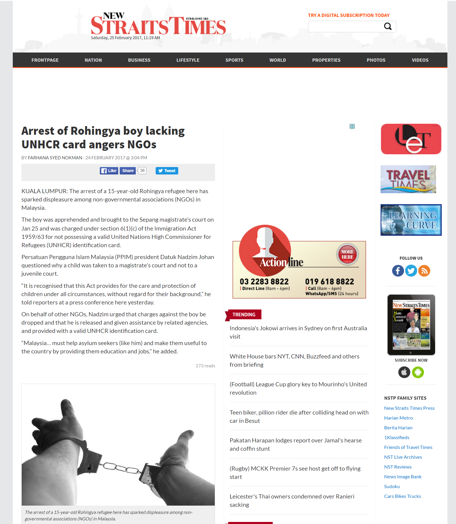 KUALA LUMPUR: The arrest of a 15-year-old Rohingya refugee here has sparked displeasure among non-governmental associations (NGOs) in Malaysia. The boy was apprehended and brought to the Sepang magistrate’s court on Jan 25 and was charged under section 6(1)(c) of the Immigration Act 1959/63 for not possessing a valid United Nations High Commissioner for Refugees (UNHCR) identification card. Persatuan Pengguna Islam Malaysia (PPIM) president Datuk Nadzim Johan questioned why a child was taken to a magistrate’s court and not to a juvenile court. “It is recognised that this Act provides for the care and protection of children under all circumstances, without regard for their background,” he told reporters at a press conference here yesterday. On behalf of other NGOs, Nadzim urged that charges against the boy be dropped and that he is released and given assistance by related agencies, and provided with a valid UNHCR identification card. “Malaysia… must help asylum seekers (like him) and make them useful to the country by providing them education and jobs,” he added. 17 reads The arrest of a 15-year-old Rohingya refugee here has sparked displeasure among non-governmental associations (NGOs) in Malaysia.