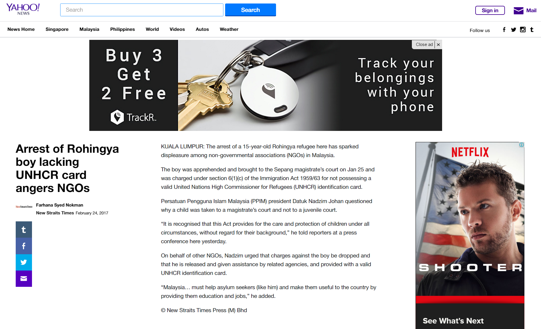 The boy was apprehended and brought to the Sepang magistrate’s court on Jan 25 and was charged under section 6(1)(c) of the Immigration Act 1959/63 for not possessing a valid United Nations High Commissioner for Refugees (UNHCR) identification card.