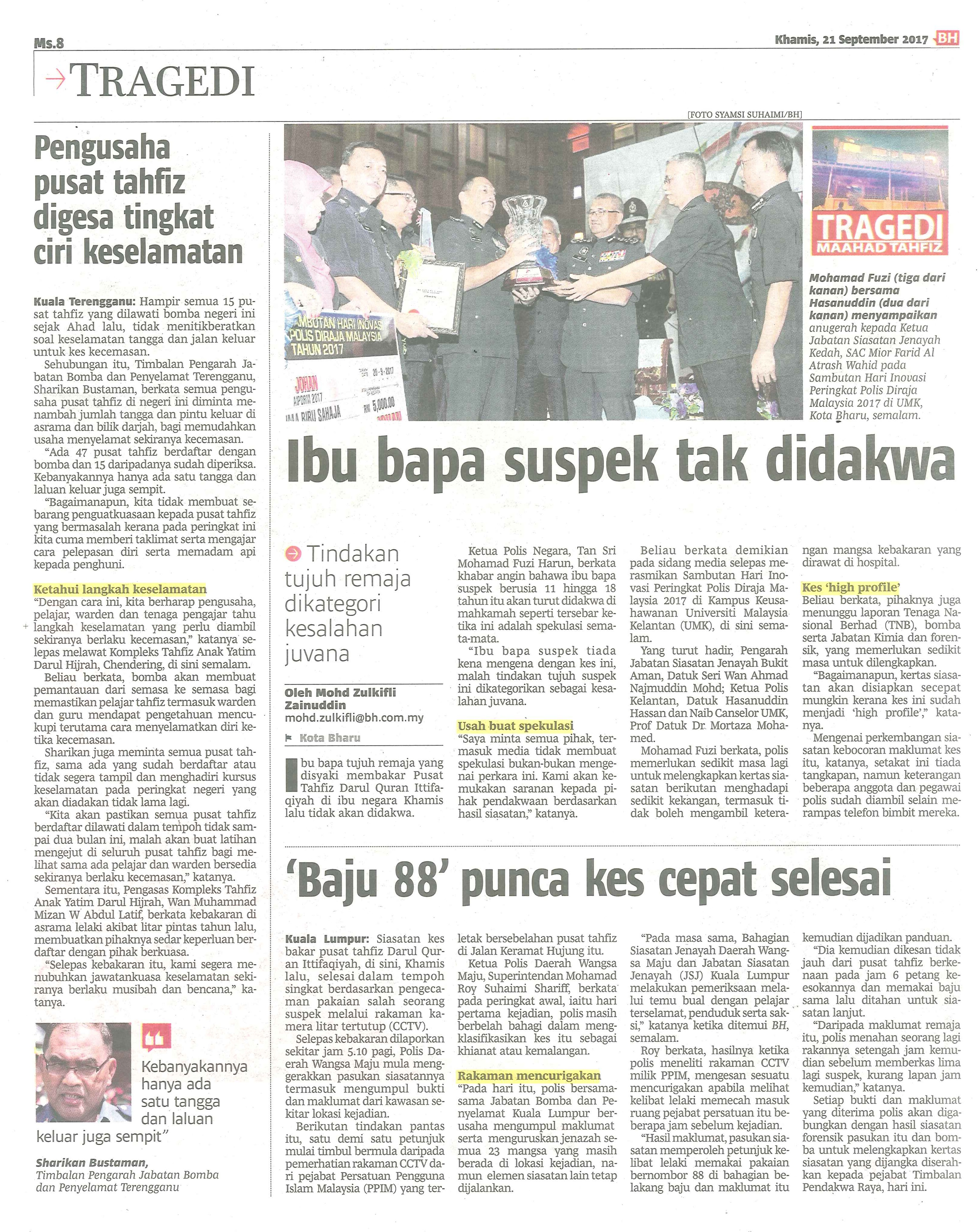 “Pada masa sama, Bahagian Siasatan Jenayah Daerah Wangsa Maju dan Jabatan Siasatan Jenayah (JSJ) Kuala Lumpur melakukan pemeriksaan melalui temu bual dengan pelajar terselamat, penduduk serta saksi,”katanya ketika ditemui BH, semalam.