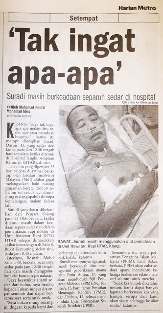 Kunjungan terkini pagi ini mendapati En Suradi yang baru tersedar dari koma mengalami komplikasi dalaman dan kini sedang bertarung nyawa. Para doktor dan pembantu rawatan sedang berusaha membantu sedaya upaya menyelamatkan beliau.