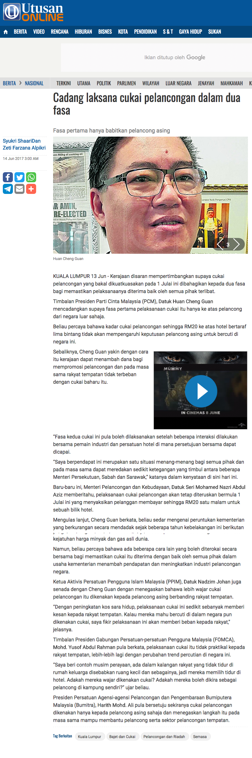 Baru-baru ini, Menteri Pelancongan dan Kebudayaan, Datuk Seri Mohamed Nazri Abdul Aziz memberitahu, pelaksanaan cukai pelancongan akan tetap diteruskan bermula 1 Julai ini yang menyaksikan pelanggan membayar sehingga RM20 satu malam untuk sebuah bilik hotel.