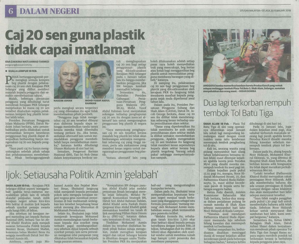 “Saya menyokong penghapusan caj 20 sen tersebut kerana masalah beg plastik ini tidak akan berkurangan sekiranya mengenakan sebarang caj yang tinggi namun, perlu ada mekanisme yang memberi kesan segera untuk mengurangkan penggunaan beg plastik.