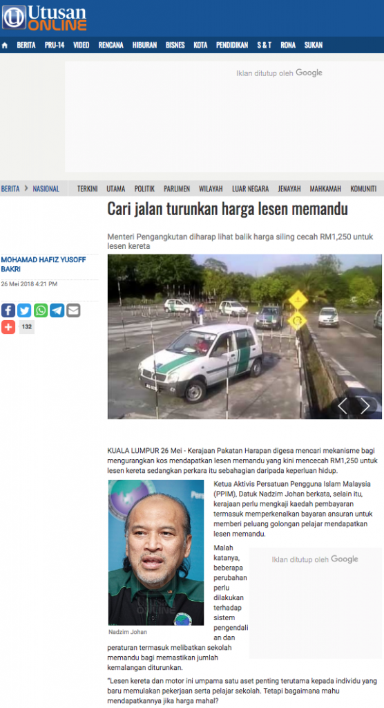 Ketua Aktivis Persatuan Pengguna Islam Malaysia (PPIM), Datuk Nadzim Johan berkata, selain itu, kerajaan perlu mengkaji kaedah pembayaran termasuk memperkenalkan bayaran ansuran untuk memberi peluang golongan pelajar mendapatkan lesen memandu.