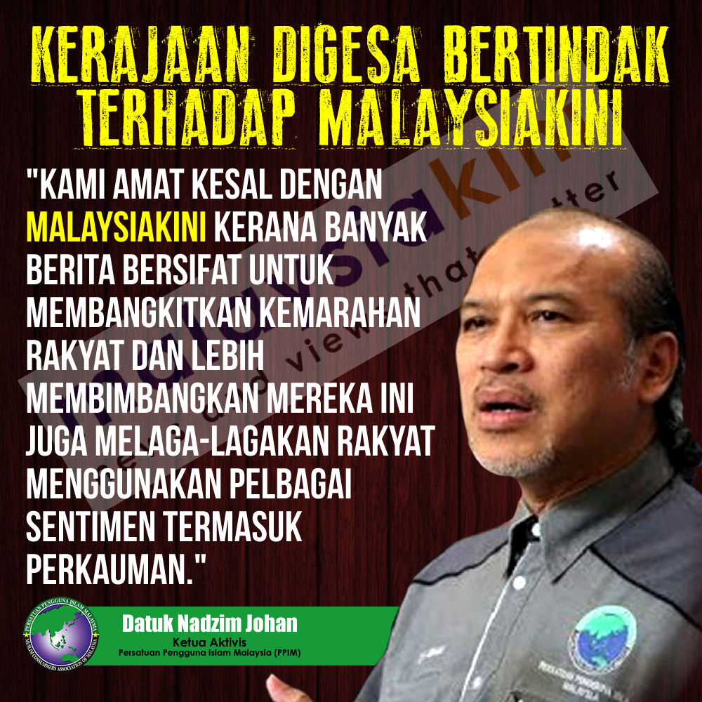 Datuk Nadzim Johan yang juga merupakan Ketua Aktivis PPIM menggesa pihak kerajaan terutamanya Kementerian Dalam Negeri (KDN) dan Suruhanjaya Komunikasi dan Multimedia Malaysia (SKMM) agar mengambil tindakan tegas terhadap portal berita atas talian Malaysiakini kerana menerbitkan (menyampaikan) berita berunsur fitnah dan hasutan.