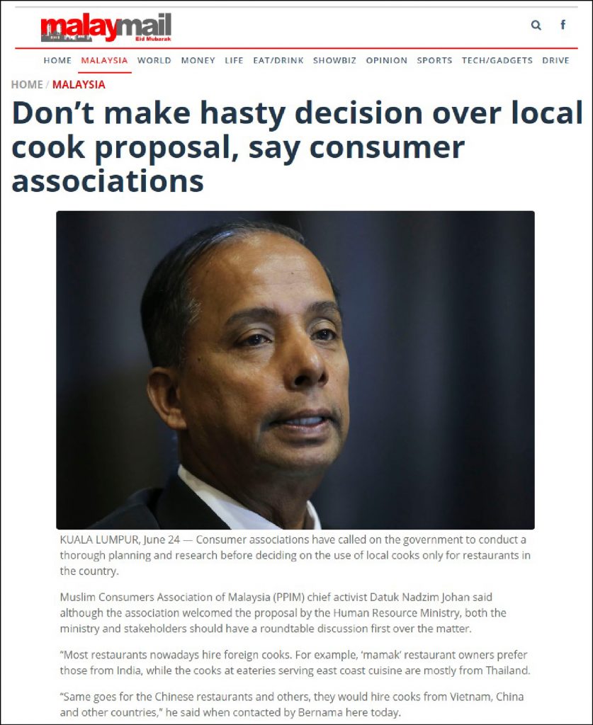 KUALA LUMPUR, June 24 — Consumer associations have called on the government to conduct a thorough planning and research before deciding on the use of local cooks only for restaurants in the country.