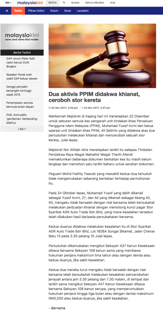 Pada 24 Oktober lepas, Muhamad Yusof yang lebih dikenali sebagai Yusof Azmi, 27, dan Ali yang dikenali sebagai Abang Ali, 50, mengaku tidak bersalah dengan niat bersama telah bersubahat melakukan perbuatan khianat dengan memotong kunci pagar Stor Syarikat AGR Auto Trade Sdn Bhd, yang mana kesalahan tersebut telah dilakukan hasil daripada persubahatan bersama.