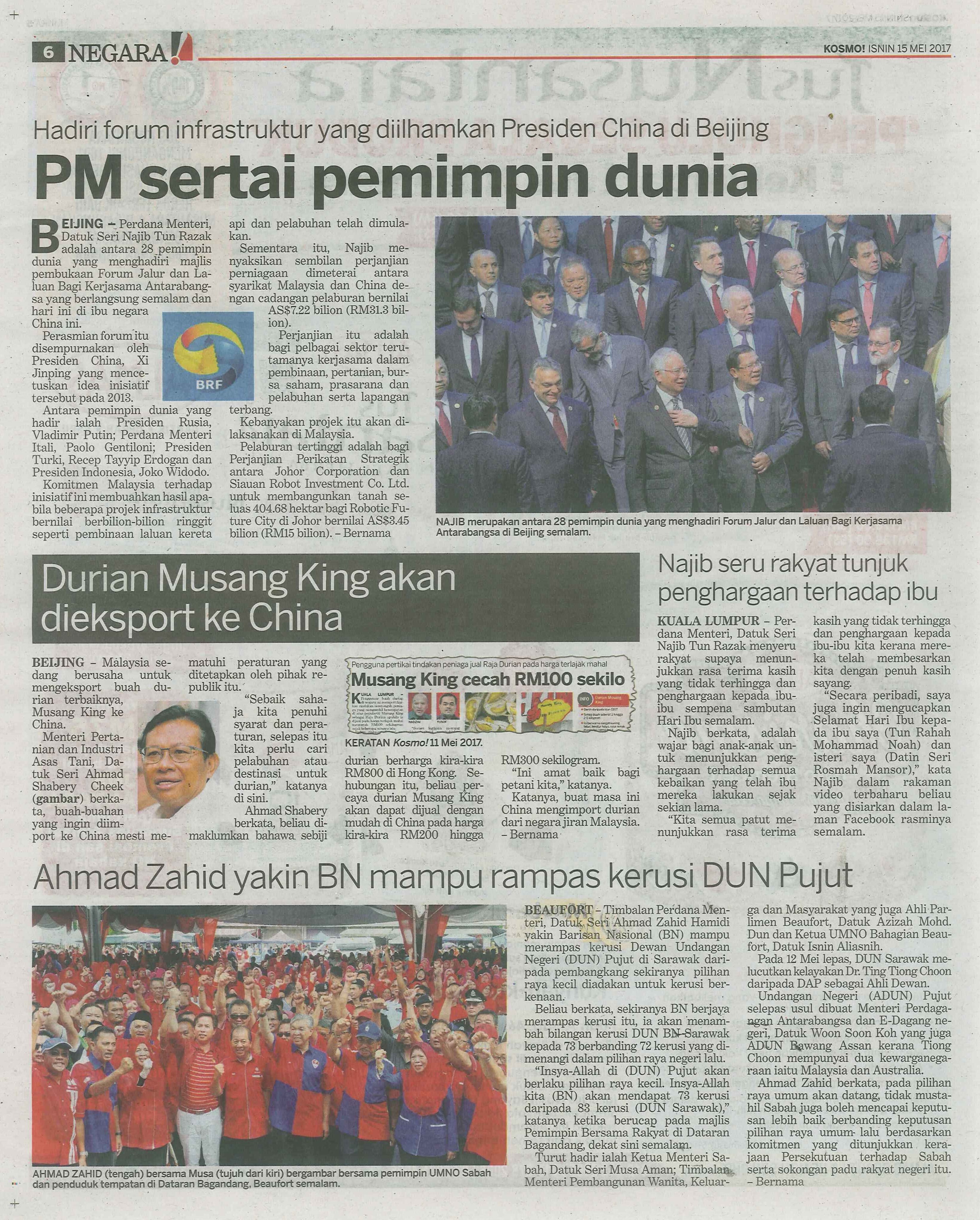 Katanya buat masa ini China mengimport durian dari negara jiran Malaysia. Semalam di Beijing bersama Perdana Menteri Datuk Seri Najib Tun Razak yang kini dalam rangka lawatan kerja lima hari di China, Ahmad Shabery telah menandatangani perjanjian persefahaman dengan pihak berkuasa China bagi pengeksportan nanas buat kali pertama ke republik itu.