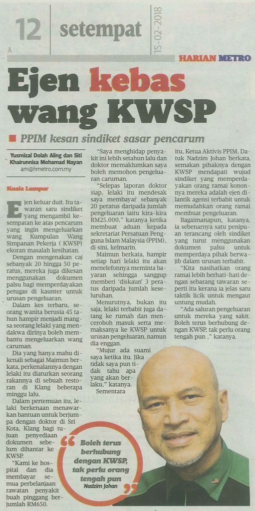 Sementara itu, Ketua Aktivis PPIM, Datuk Nadzim Johan berkata, semakan pihaknya dengan KWSP mendapati wujud sindiket yang memperdayakan orang ramai kononnya mereka adalah ejen dilantik agensi terbabit untuk memudahkan orang ramai membuat pengeluaran.
