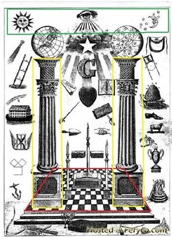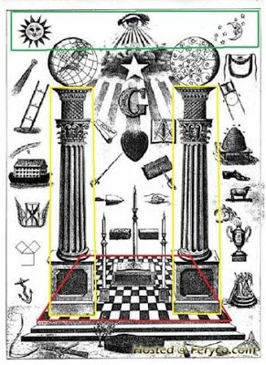 Tak perlulah rasanya saya terangkan unsur masonic yang telah saya highlightkan dengan garisan berwarna kuning. Menara KLCC yang terkenal di serata dunia dengan nama Menara Berkembar Petronas telah menepati ciri ini. Dua tiang ini adalah Jachin dan Boaz yang menjadi lambang kebanggaan Freemason. Bekas-bekas Presiden Amerika yang menjadi ahli tertinggi Freemason seperti George Washington telah meletakkan kedua-dua tiang ini di hadapan kubur masing-masing sebagai tanda kebanggaan mereka